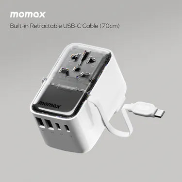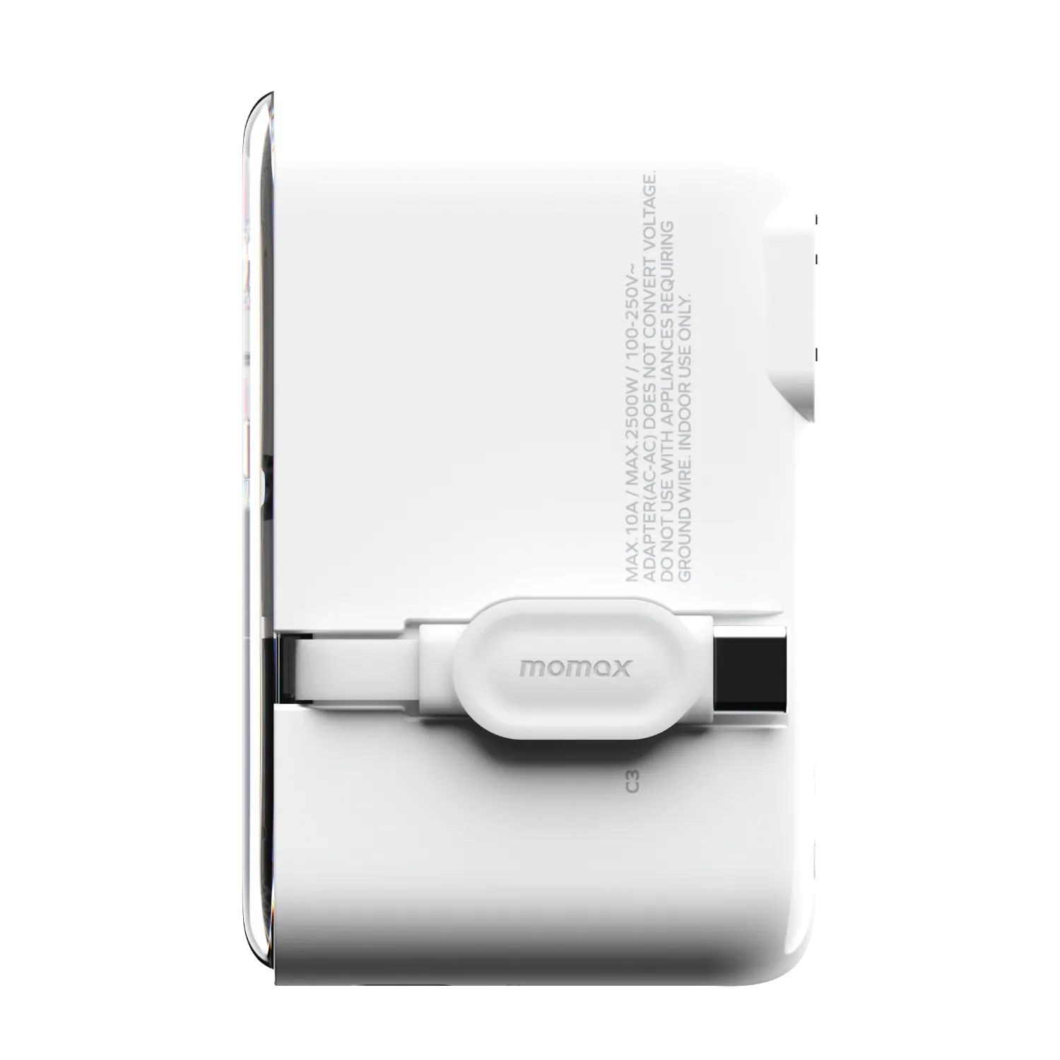 Momax UA21 旅行插座結合 35W 快充與內建 USB-C 充電線設計,支援多國插頭轉換與多孔輸出,無論你身在世界哪裡,都能輕鬆為手機、平板、筆電等裝置補電,整齊收納不打結,旅行更輕鬆!