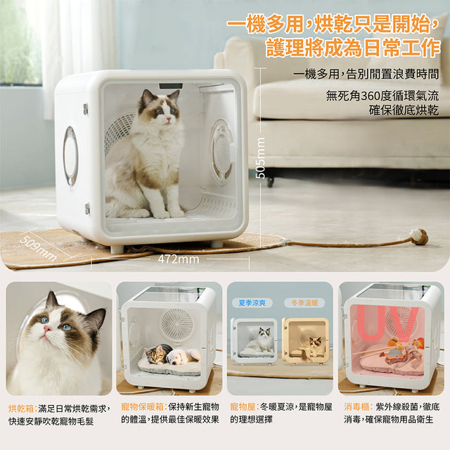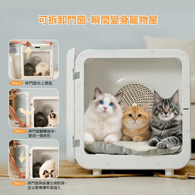- 前門採用全拆卸式設計,完全拆卸前門後可輕鬆轉換為開放式寵物窩。冬季可調至溫暖窩模式,夏季可切換清涼窩模式,一機多用超越傳統烘乾機