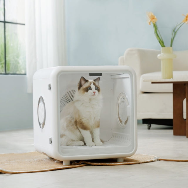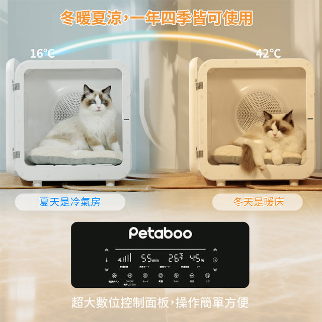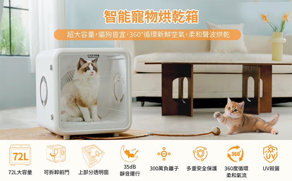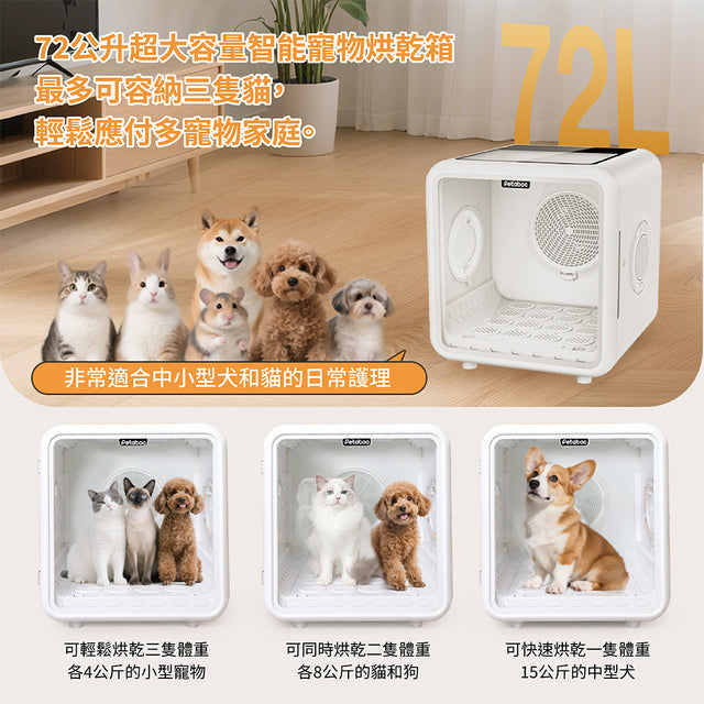 Petaboo推出智能烘乾箱,只要將貓貓狗狗放進去,最快15分鐘極速烘乾,72L大空間,可以輕鬆容納最多3隻寵物,運作聲只有35dB,不用擔心寵物害怕。最棒的是還有貼心的「寵物安撫窗」,烘乾過程中主人可以跟寵物互動