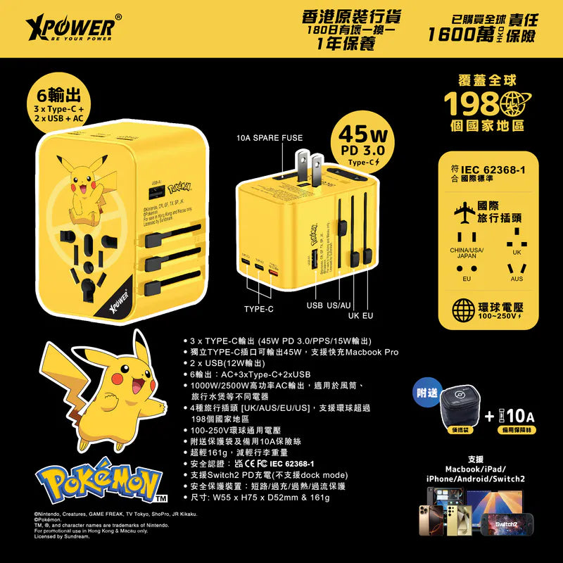Pokémon ピカチュウ 比卡超 Pikachu TA45B 45W 6輸出 PD3.0/PPS旅行充電器
