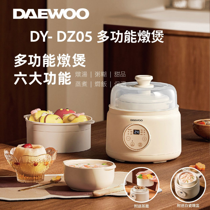 DAEWOO 新出品DY- DZ05 多功能燉煲,一款多功能的料理幫手,六大功能︰燉湯、粥糊、甜品、蒸煮、燜飯、保溫任君選擇。附送蒸籠更能體驗上蒸下燉的高效料理,輕巧機身方便收納,分體式設計更易清潔。12H保溫,15H預約的定時設計更是家居廚房必選!