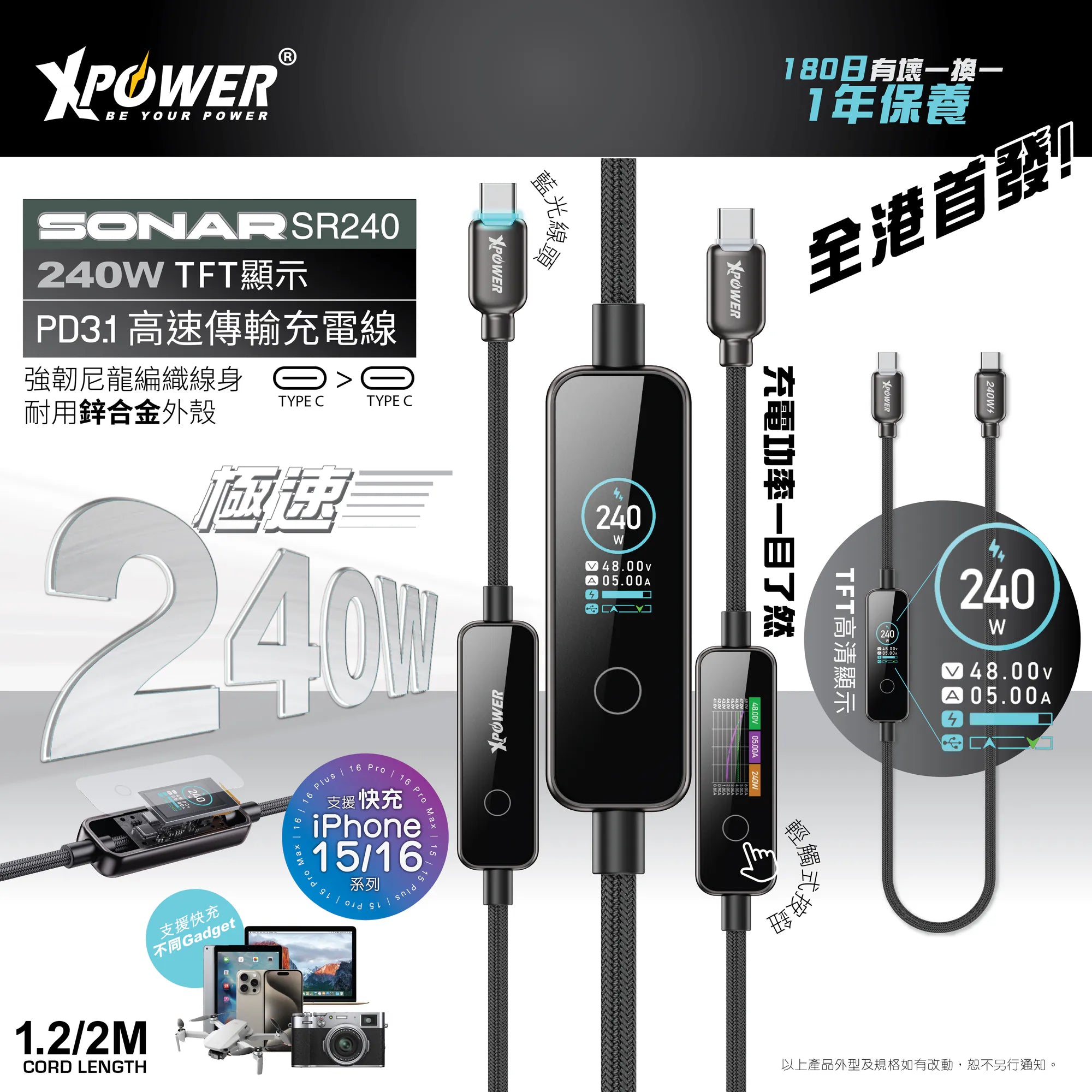 這款全新推出的 XPower SONAR SR240 高速充電線,支援最新 PD3.1 協議,最高輸出達 240W,搭配 TFT 彩色顯示螢幕與鋅合金接頭設計,不僅效能強悍,外型也極具科技感,是你筆電、手機、平板的最佳充電拍檔!