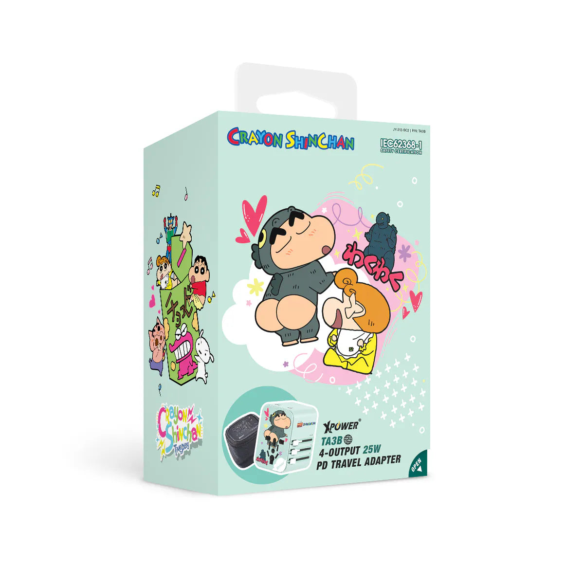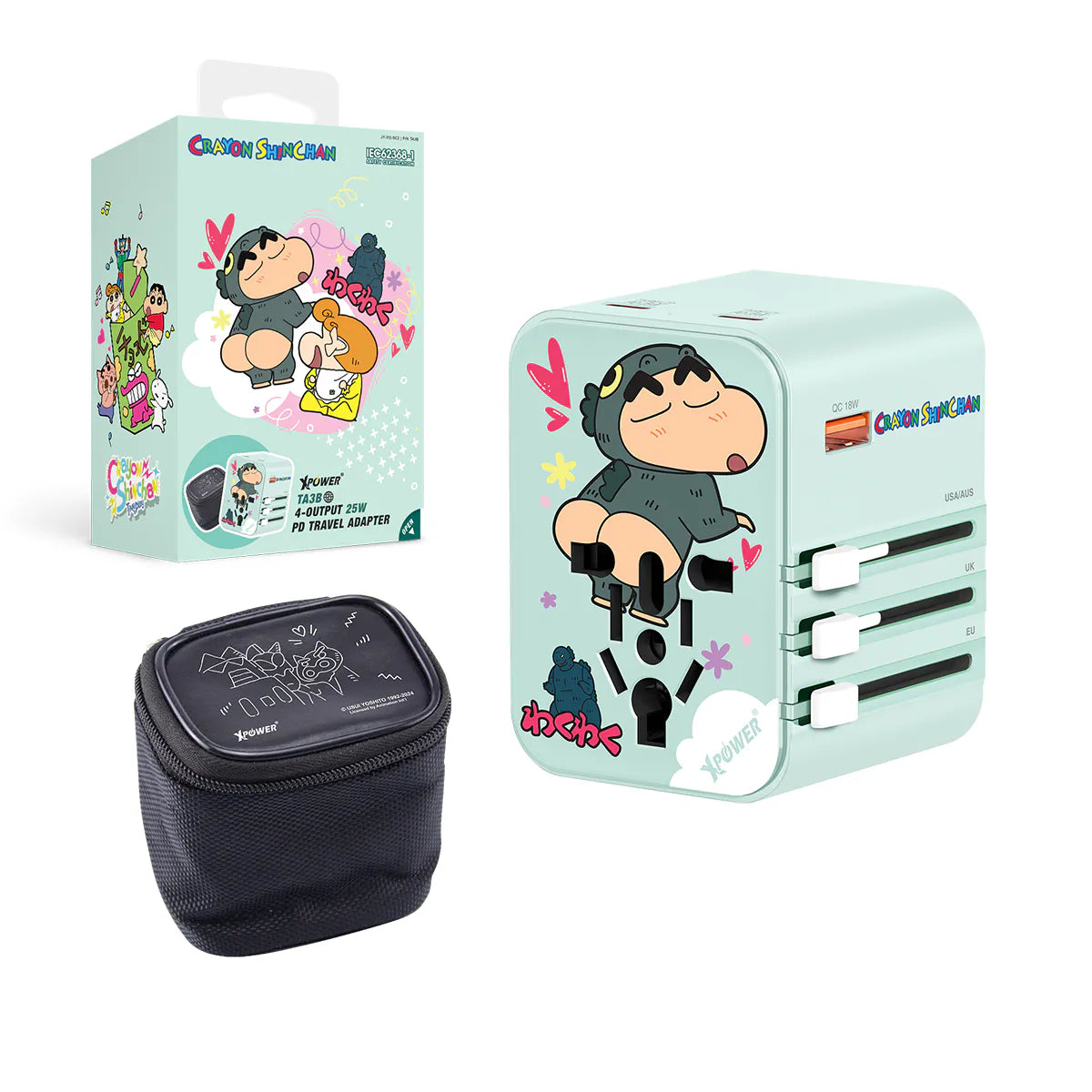 XPower 攜手國民級人氣角色 蠟筆小新 推出全新聯名款 TA3B 旅行充電器(綠色款),不僅外型清新可愛,還具備 4孔輸出設計、PD3.0/PPS 快充技術 與 多國插頭轉換功能,讓你無論出國、出差或日常使用都能輕鬆補電,隨時保持滿格狀態!