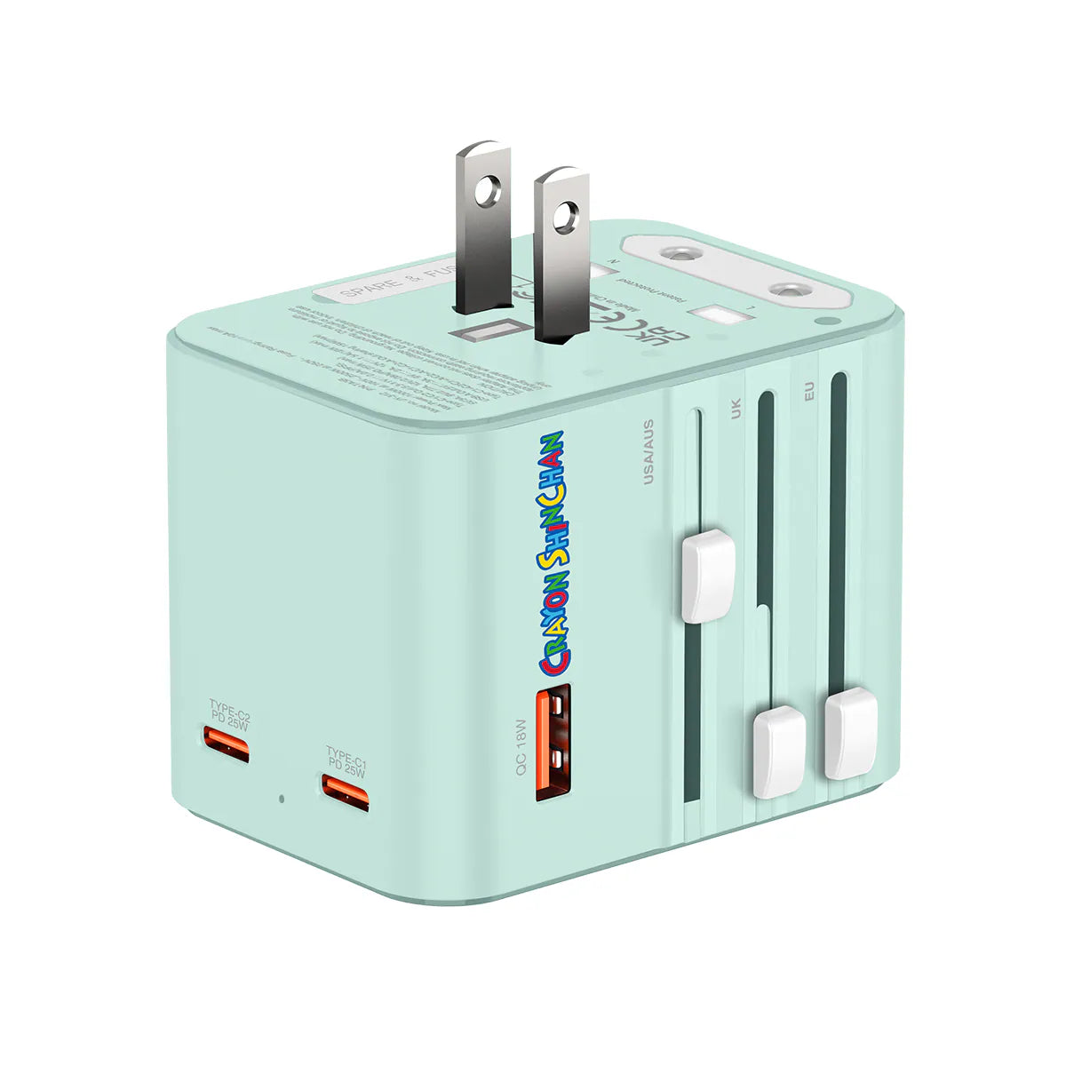 🧒 蠟筆小新聯名設計(綠色款):清新綠色搭配童趣插畫風格,讓你的充電器也能成為旅行中的可愛亮點。