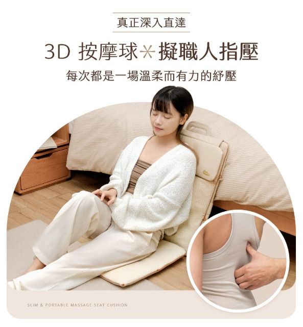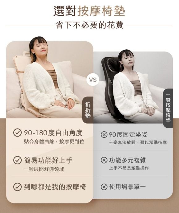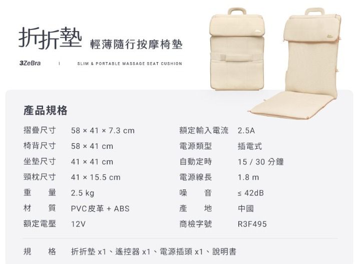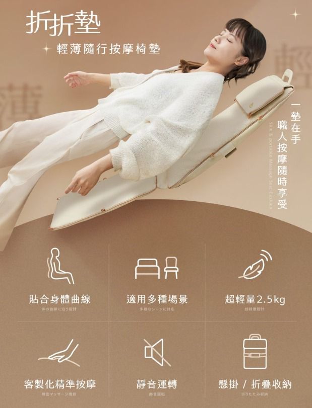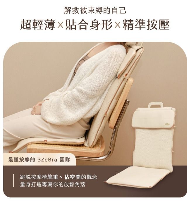 台灣按摩護理品牌3ZeBra最新推出 折折墊|輕薄隨行按摩椅墊,可以帶來猶如真人按摩既舒適體驗,超越市面上按摩椅墊!僅2.5kg輕盈重量,加上可折疊設計,做到好收納好攜帶。按摩椅墊完美貼合身形,透過3D按摩球做到深層揉捏、推壓、定點施力,針對穴道與肌肉層層釋壓,按摩更到位!量身打造專屬你的放鬆角落。