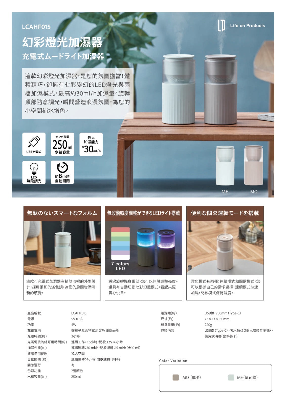 日本 Life on Products LCAHF015 幻彩燈光加濕器