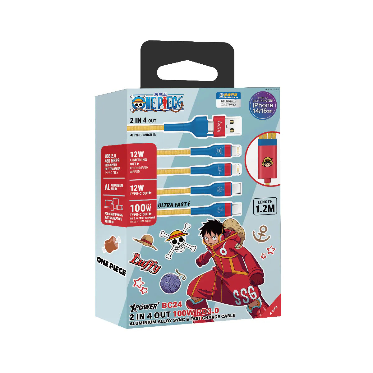 XPower x One Piece BC24 8合1 2出4 100W PD3.0 鋁合金傳輸快速充電線 (路飛)